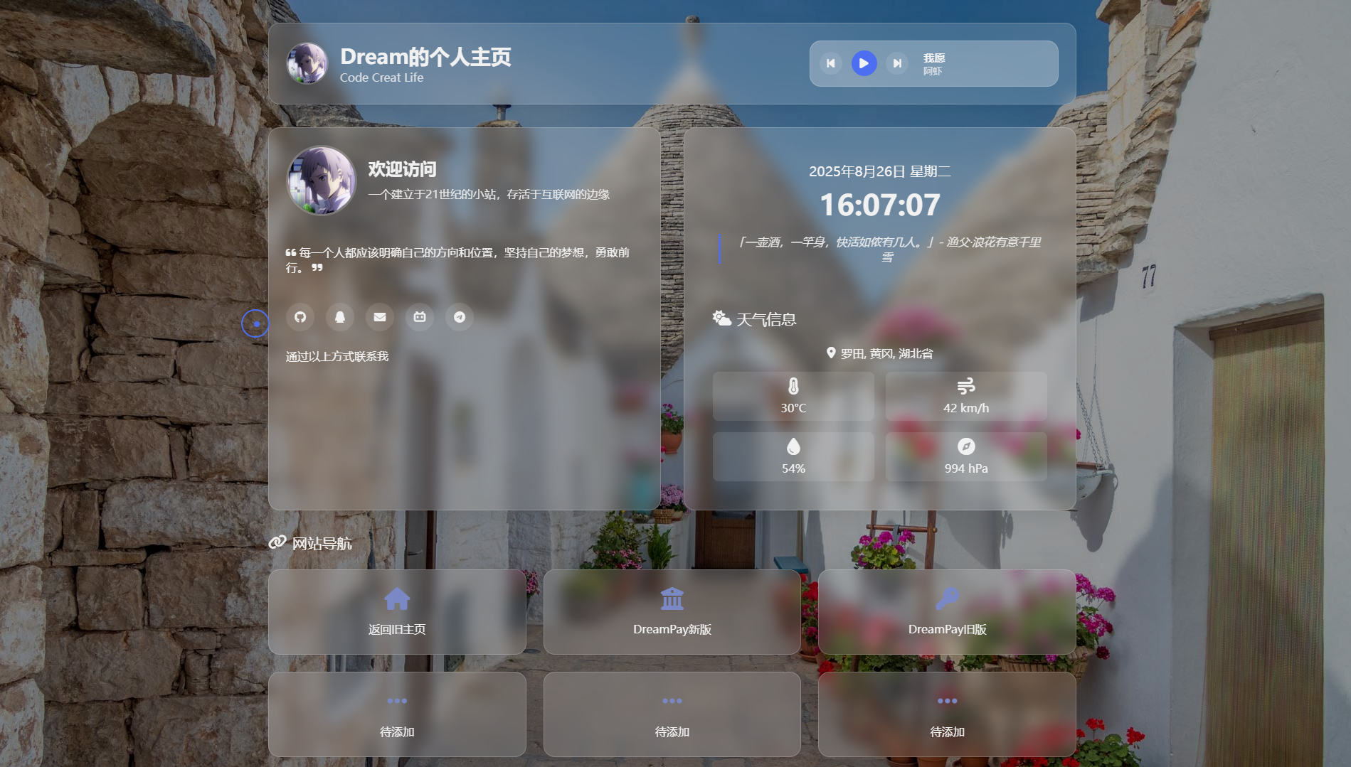 欢迎使用Dream的个人主页源码,这款个人主页简洁,体积小但功能齐全,有精美的模糊效果,bing每日一图为背景等