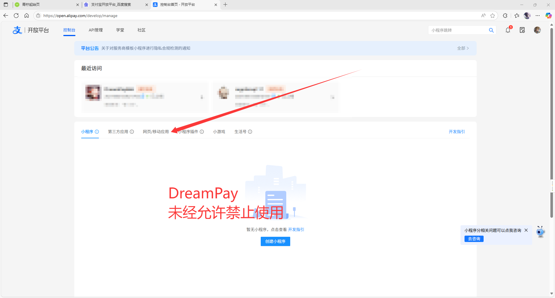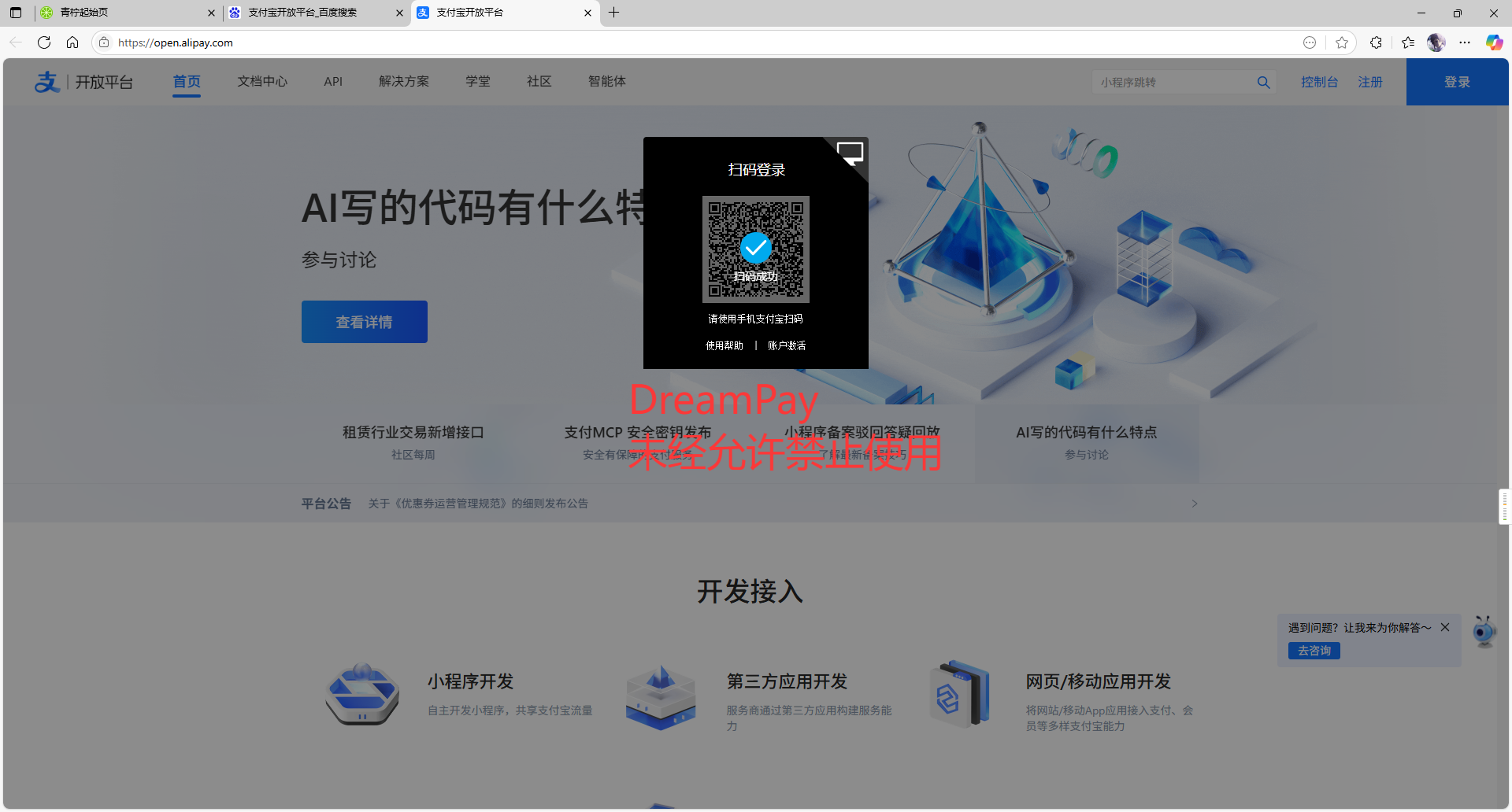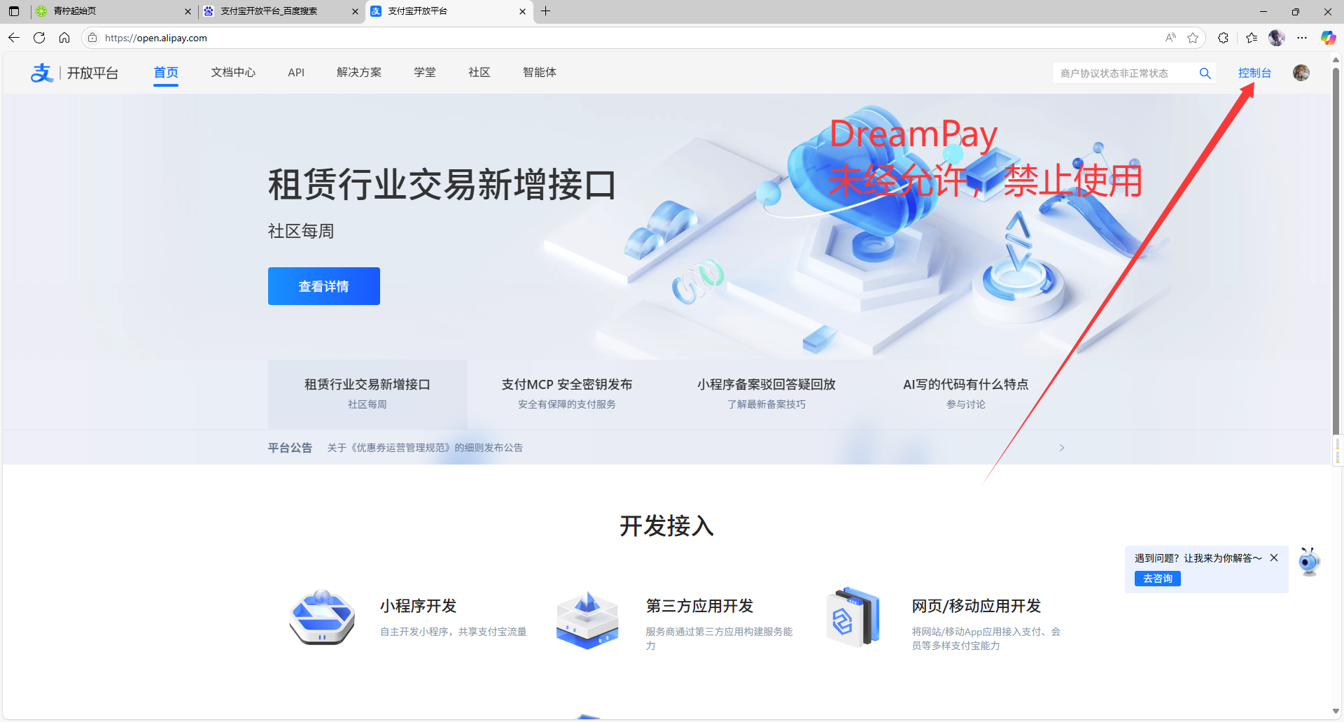 首先在浏览器搜索支付宝开发平台(或单击这里)进入支付宝开放平台