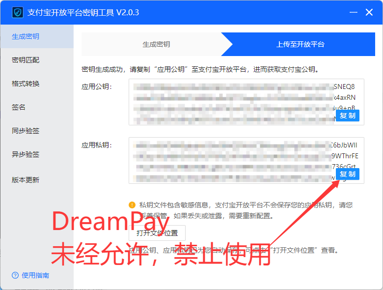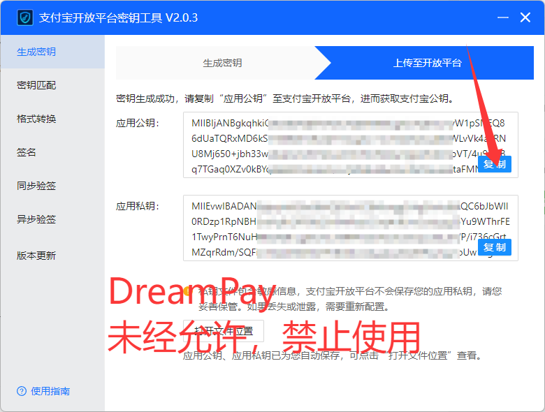 复制应用公钥(复制好后不要关闭密钥工具),然后返回开放平台粘贴